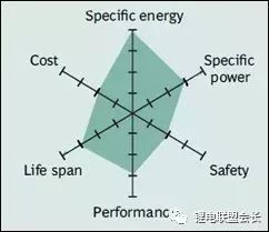 圖1:NCA的蜘蛛圖。高能量和功率密度以及良好的使用壽命使NCA成為EV動力系統的候選者。高成本和邊際安全性卻有負面的影響。