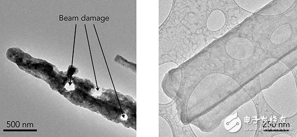 左圖:在室溫下的TEM圖像中,鋰的枝晶因暴露在空氣中而被腐蝕,電子束也在上面熔出大量孔洞;右圖:cryo-EM下的圖像,冷凍環(huán)境保存了其原來(lái)的狀態(tài),表明其有明確界面的晶體納米線。